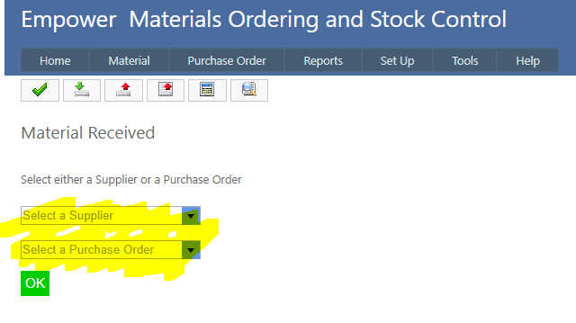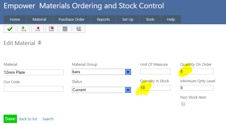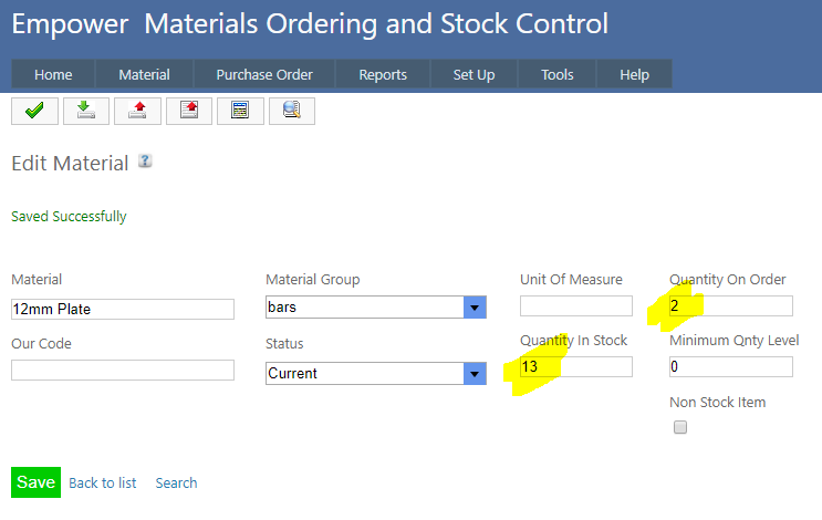 As an example, imagine that 3 X 12mm plates were received, then the Quantity on Order would reduce to 2, and the Quantity In Stock would increase to 13 (see highlighted below).