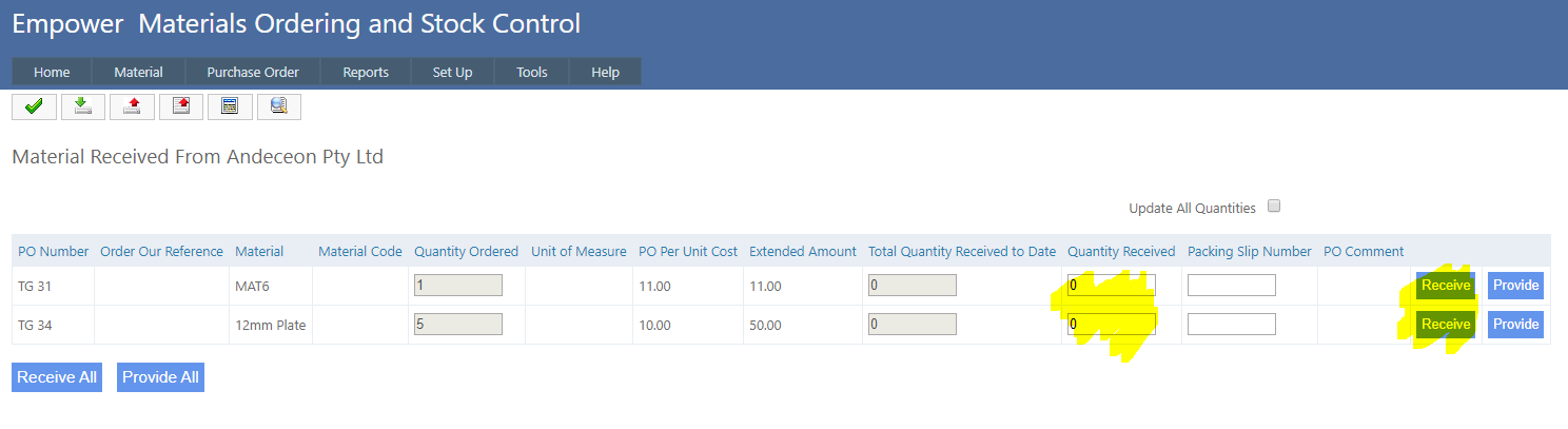 Input the required information including Quantity Received (see highlighted above) and then click Receive. Note that you can also Provide Materials in this page.