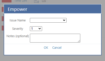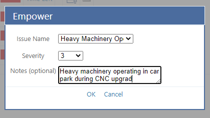 Select an Issue Name, a Severity and add an optional Note and click OK to save - see below as an example.