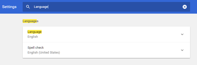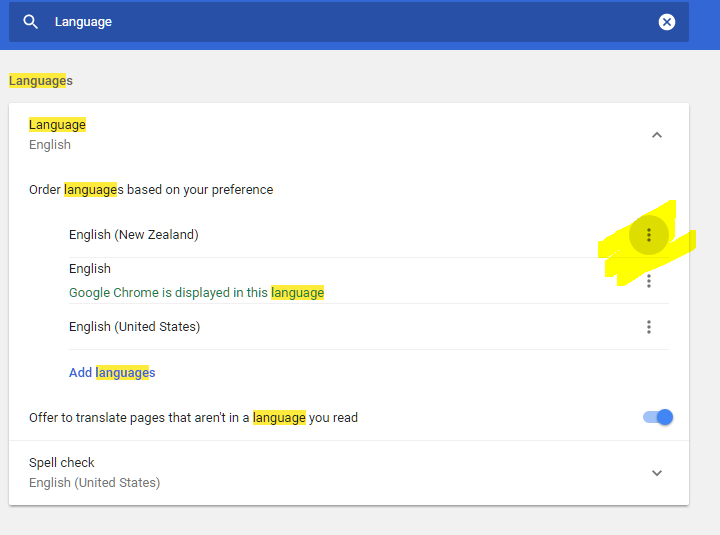 3. Then in the search settings field (highlighted above) type in Language.