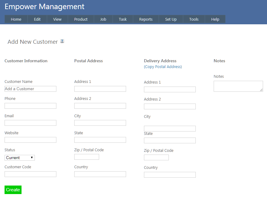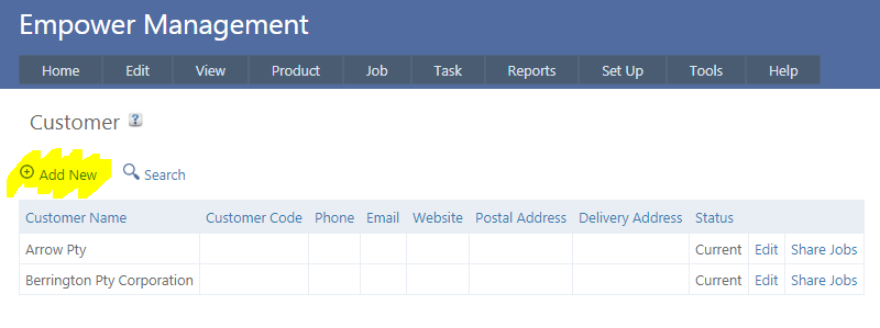 To set up a Customer, from the main menu, go to Set Up > Customer and click on Add New.