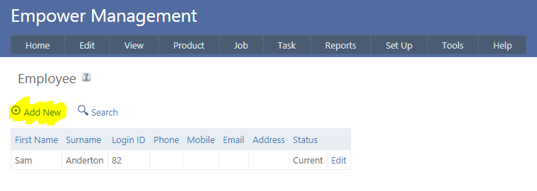 To set up a new Employee, from the Management Main Menu select Set Up > Employee and click on Add New.