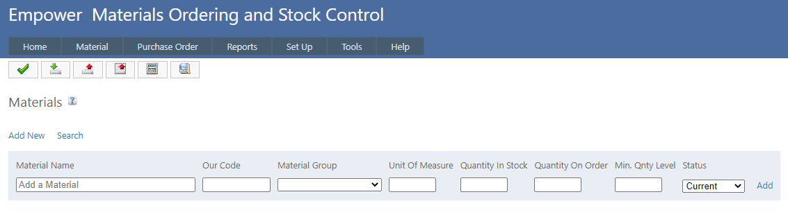 To set up Materials in Empower Materials Ordering and Stock Control, from the Main Menu, go to Set Up > Material.