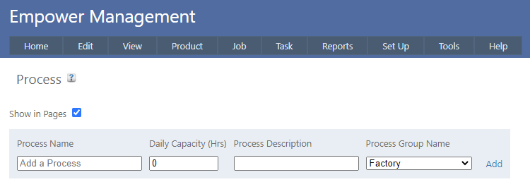 Leave Capacity at 0 and Process Description blank at this stage and then click Add.