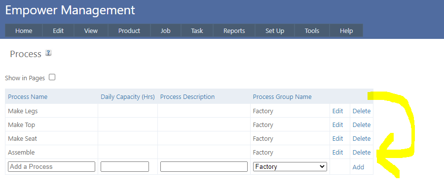 Processes are steps carried out in your manufacturing operation – examples of Processes are cut, assemble, etc.