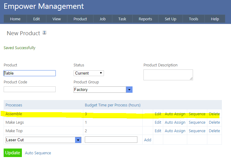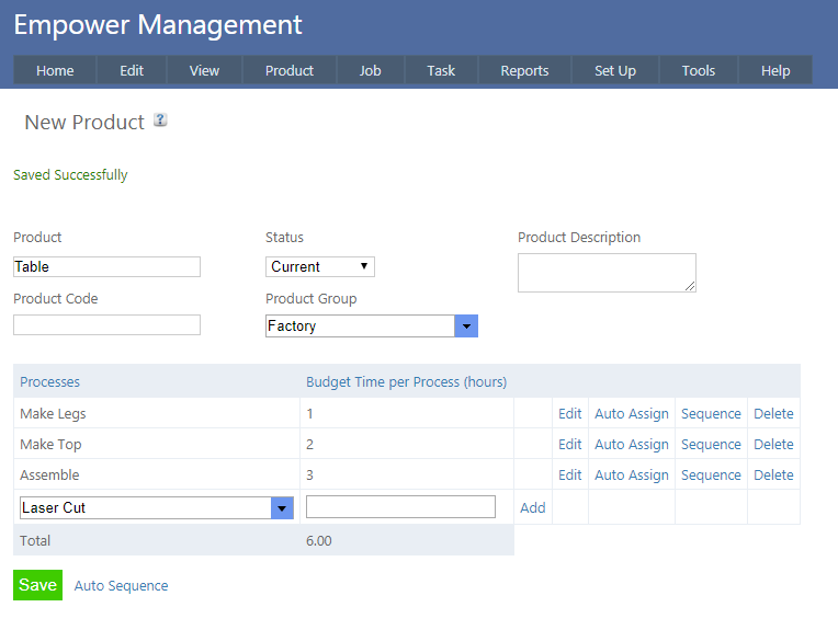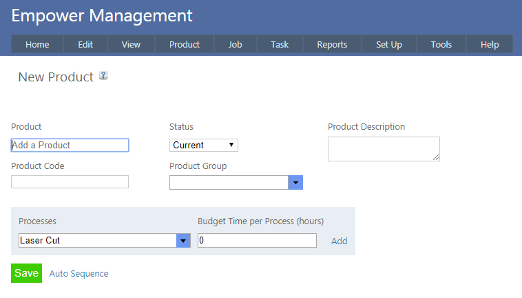 Then click on the arrow to the right of the box under Processes and select each Process you require and the Budget Time if you know it - then click Add. See also Product Budget Times.
