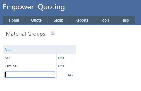 To set up a Material Group in Empower Quoting, from the main menu, go to Set Up > Material Group.