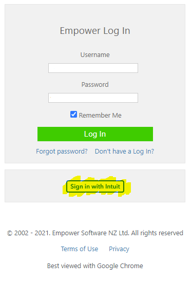 Empower allows Intuit and QuickBooks Online users to log in using their Intuit / QuickBooks Email or User Id and Password details (your Intuit credentials).