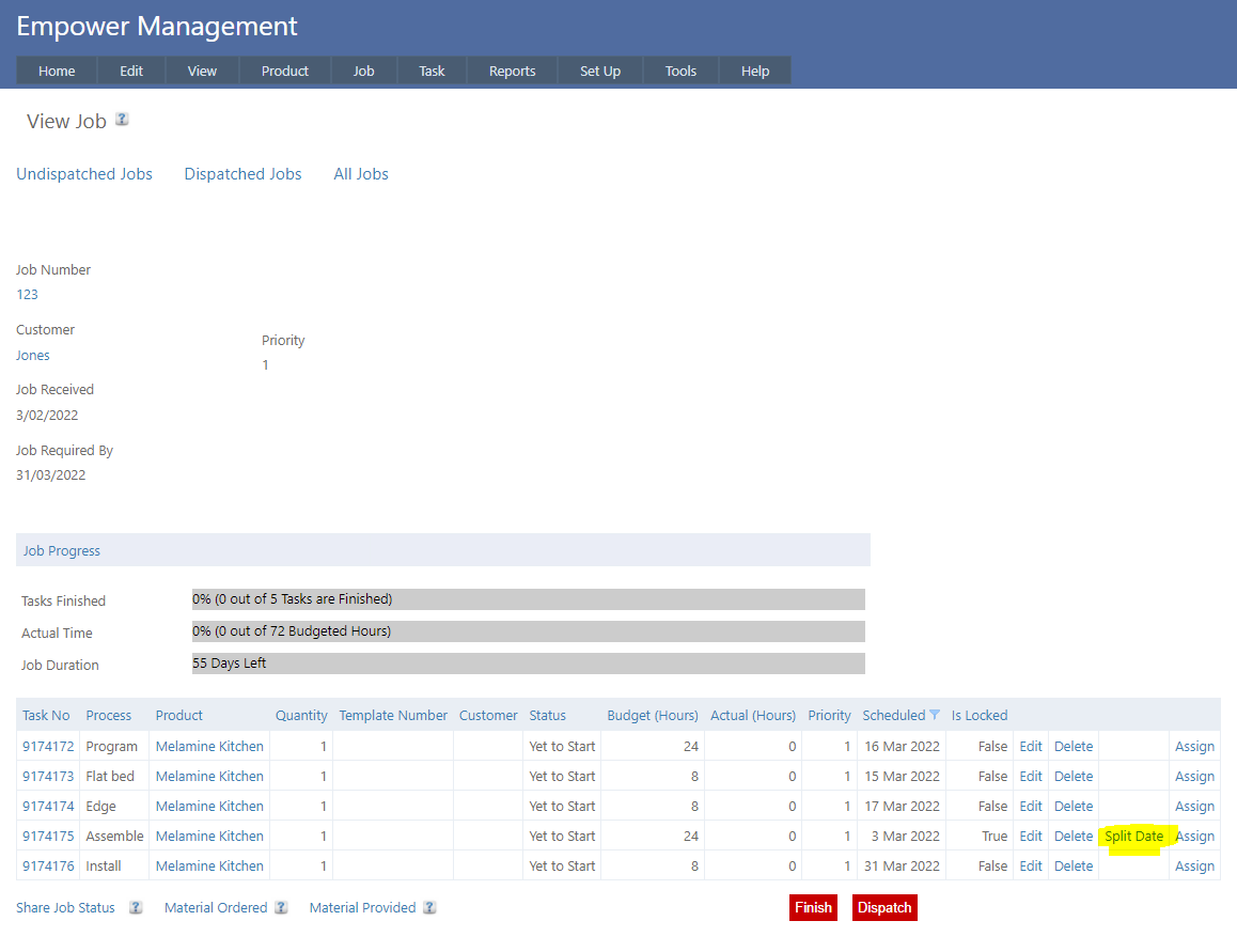 Note that this is also visible in the Job > View > View Job page. If a Task is split clicking on Split Date (see highlighted below) will display the dates the Task is split across.