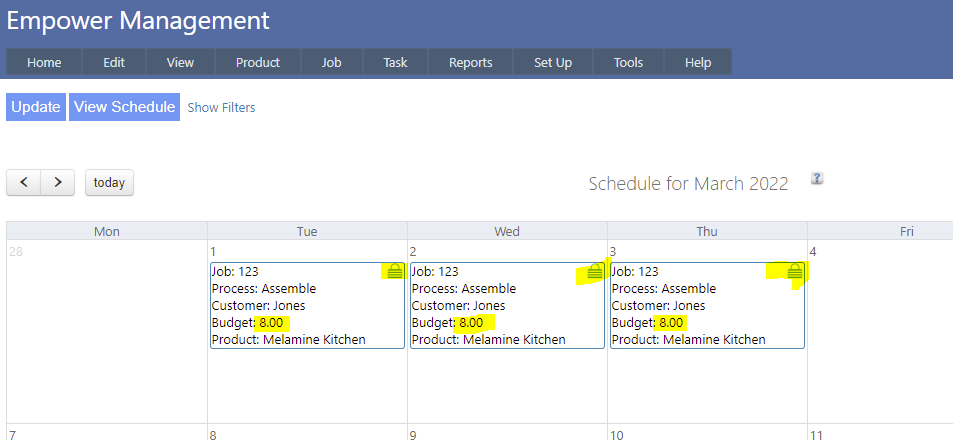 And your Schedule requires Assemble Tasks to be finished one day after the Job Received date (for more information on setting up Schedules - see Add New Schedule).