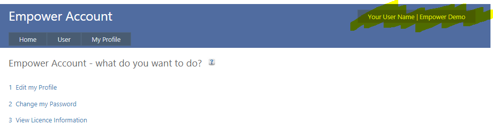 To navigate to other Empower modules (e.g. to Factory or Management modules) click on your Username and company at the top right hand side of the page (see highlighted below) and select the module you wish to go to.
