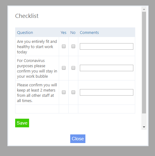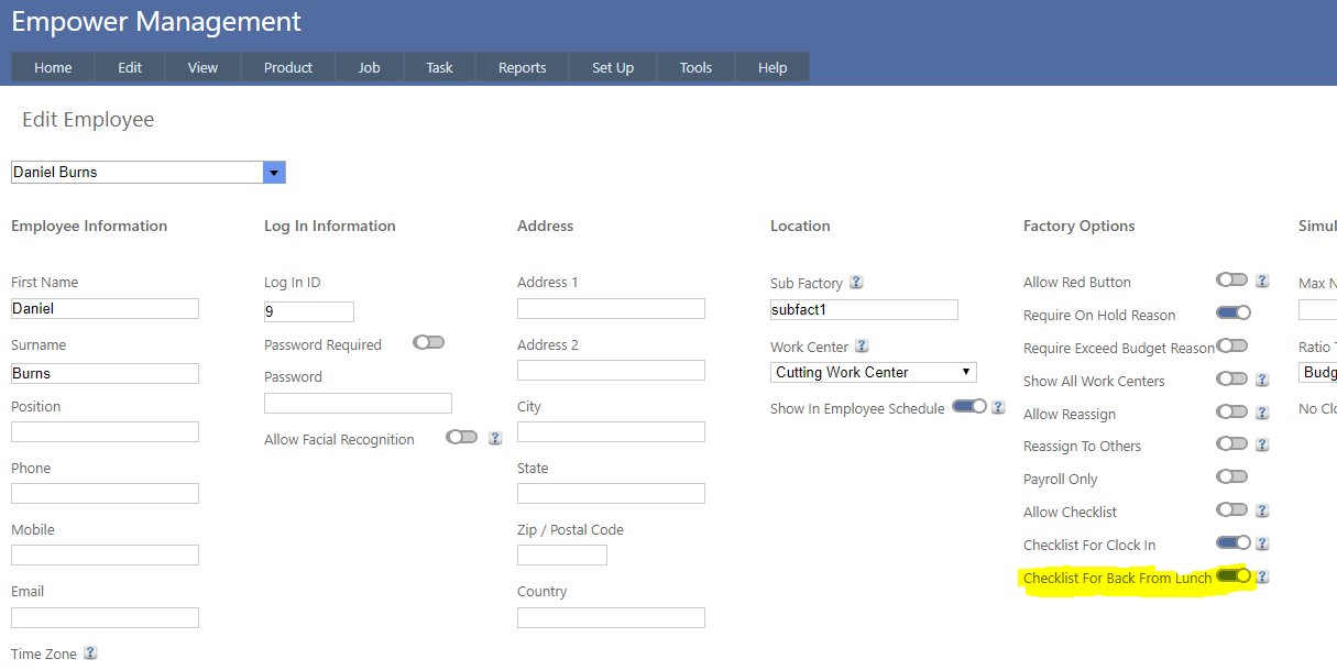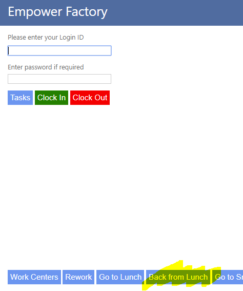 The Back From Lunch Checklist is a special Checklist that is triggered every time an Employee clicks the Back From Lunch button in the Factory version (see highlighted below).