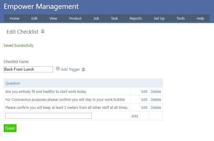 The Back From Lunch Checklist differs from other Checklists in that it does not need a Trigger to be added.