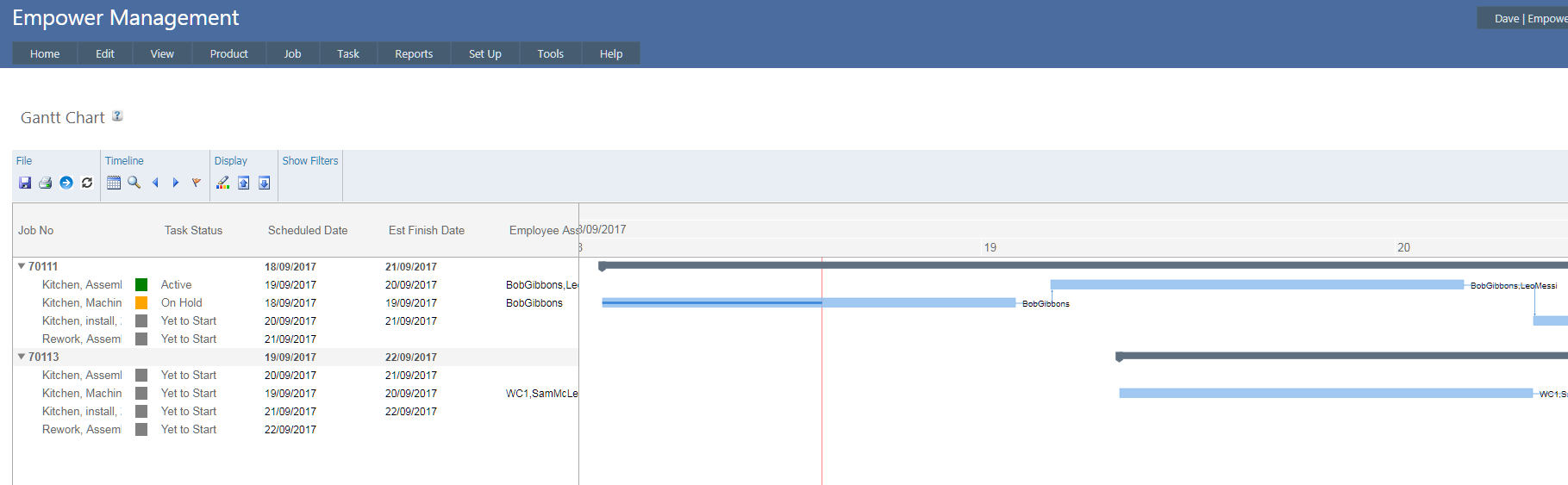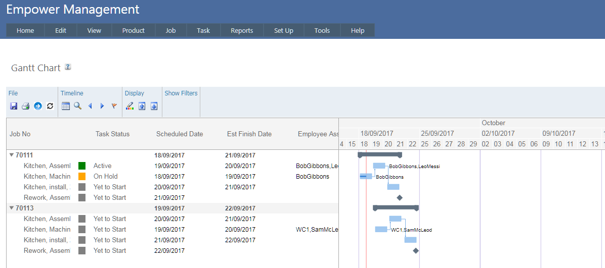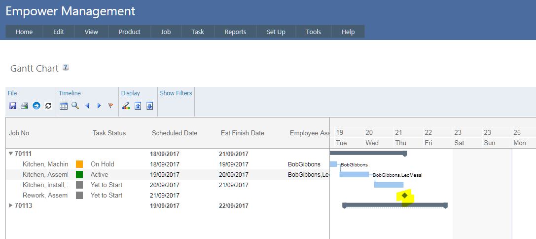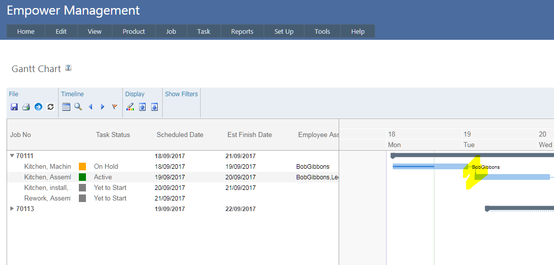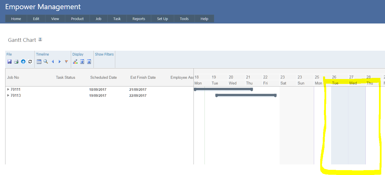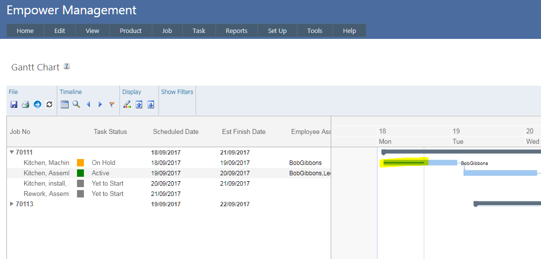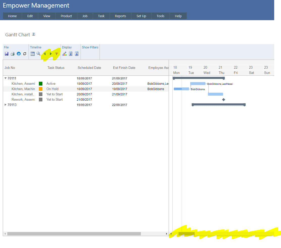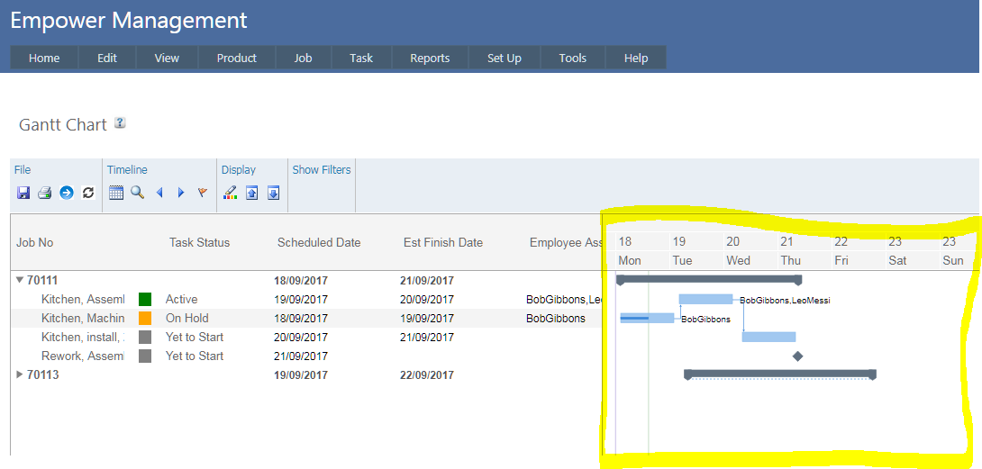 1. The Calendar Section of the Gantt Chart displays Jobs, Tasks and related information (see below highlighted in yellow)
