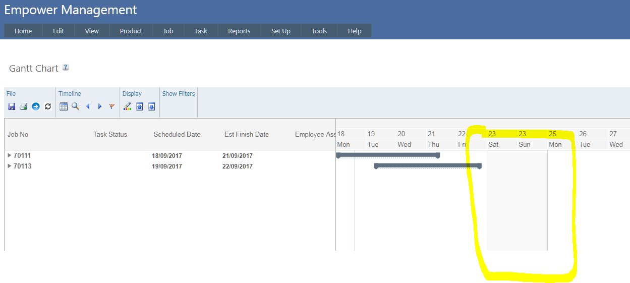 4. Weekends will be shown as slightly shaded (see outlined below) - for more information on hiding weekends see Hide Weekends.