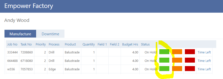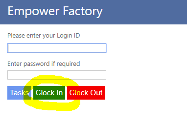 Or on clicking a green start button in the Manufacture or Downtime tabs in the Factory version when Logging In to a Task if the Employee is Clocked Out (see highlighted below)