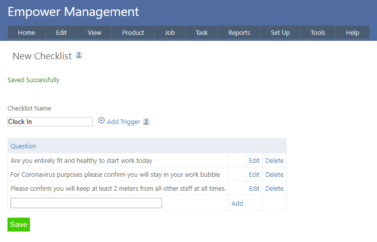 It differs from other Checklists in that it does not need a Trigger to be added and you can only have one Clock In Checklist.