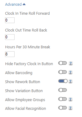 Clock in Time Roll Forward – This sets the cut off time (in minutes) that Clock In times will be rolled forward or backwards to the quarter hour. For example, if the number is 5, then any Employee clocking in at 6:56 a.m. (4 minutes before the quarter hour) would have the Clock In Time recorded at 7:00 a.m. However if the Employee clocked in at 6:54 a.m. (6 minutes before) then the Clock In Time would be recorded at 6:45 a.m. This should be set between 0 and 14.