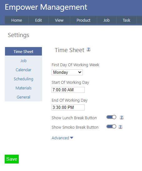 Will display Advanced Time Sheet Settings as follows: