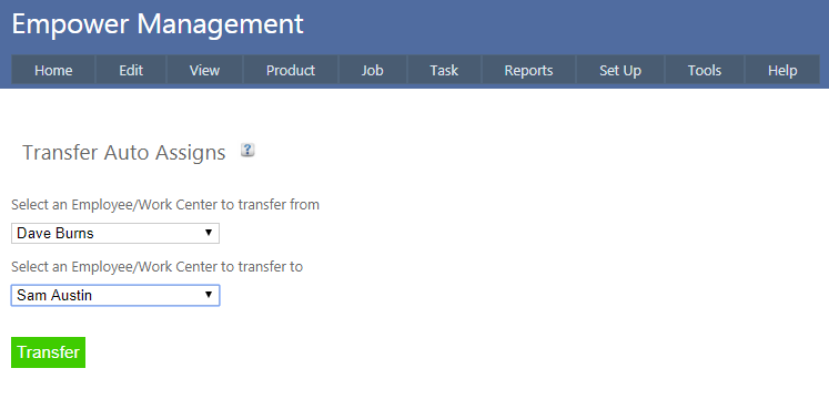 If the Employee or Work Center you are transferring to is already Auto Assigned, Empower Time Track will not double up on the Auto Assign. Note that this will transfer both Auto Assigns of Product Processes and Auto Assigns of Processes.