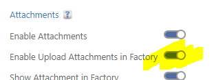 1. Enable sure that Uploading Attachments in the Factory has been enabled - to do this