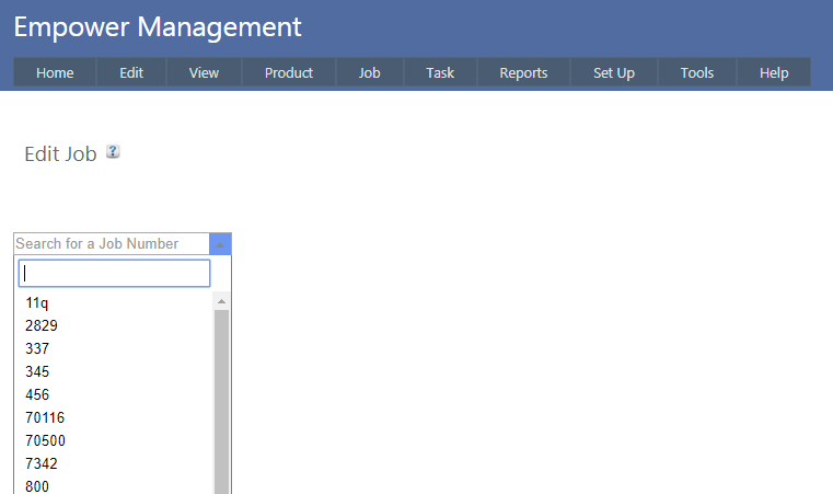 1. Clicking on the blue box with the down arrow in it will display a list of (in this instance Job number) data. You can use the scroll bar to the right of the list to scroll up or down to see further data.