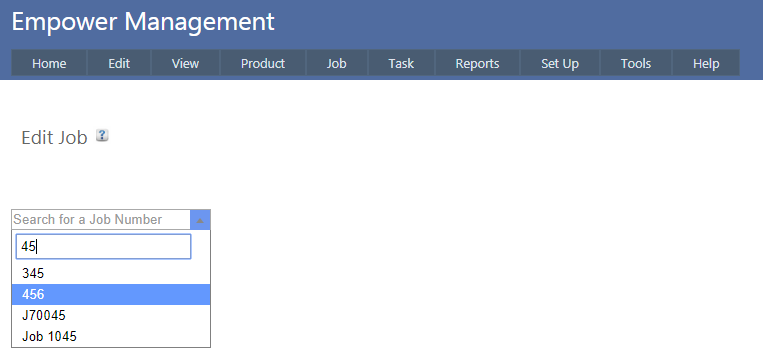 2. The second way is to use it to search. To use this, in the highlighted box below, type in what you would like to search on - in this example we want to search for all Job numbers containing 45. The drop down box will list all data items with own in them (see below for an example).