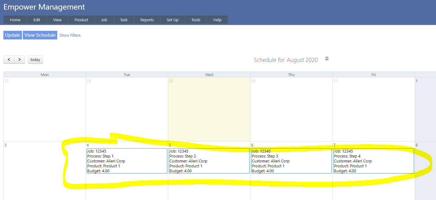 5. If an an error message saying "No Processes Match" is displayed (see highlighted below) this means that none of the Processes in the Product match the Processes in the Schedule - ie in our example above the is no Task 1 , 2, 3 or 4 and so no Processes will be scheduled.
