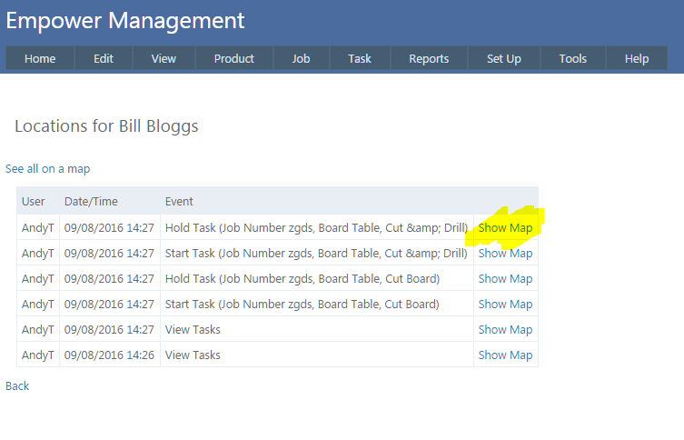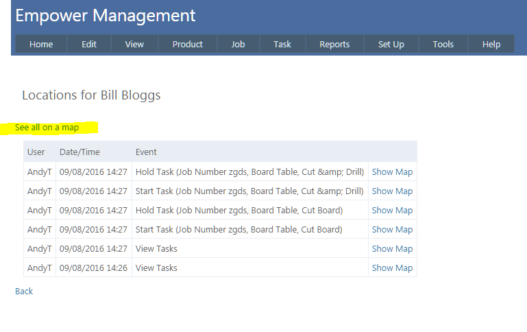 To do this, from the Main Management Menu go to View > Employee Location > For a User.