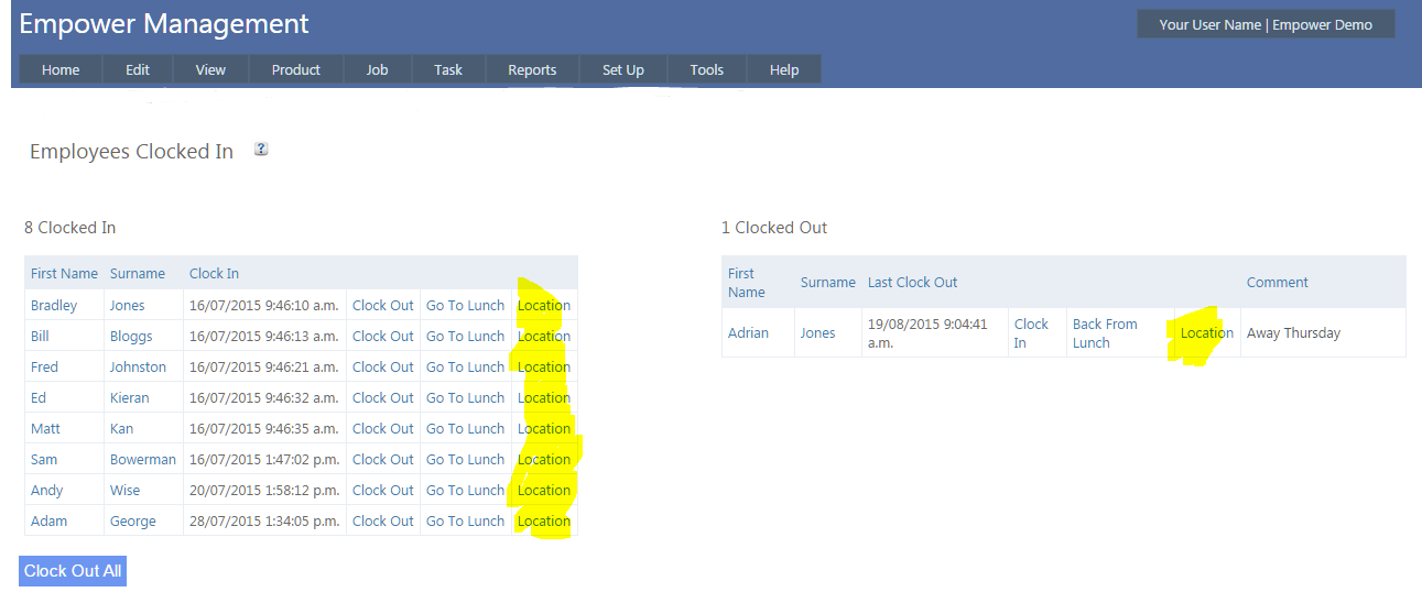 It is also possible to view the Location from the Employee Clocked In page. To do this, from the main menu go to View > Clocked In.