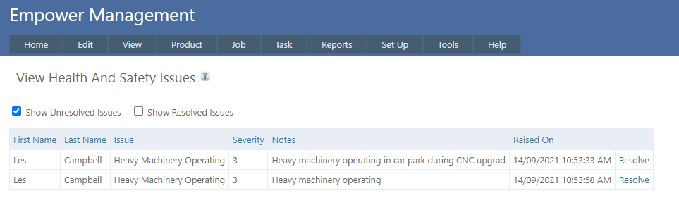 This page shows either Unresolved or Resolved Health And Safety Issues together with the Employee who raised it and the time it was raised.