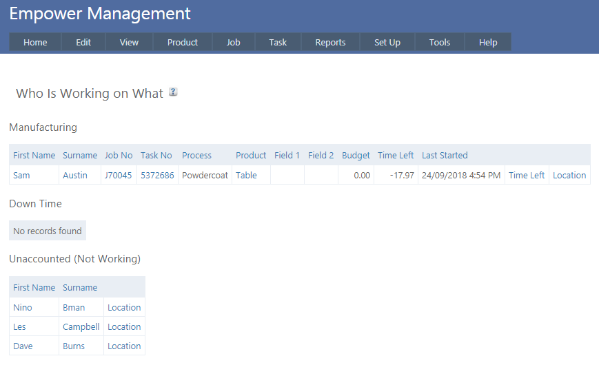 The Manufacturing part of this page shows Employees working on Tasks, together with the Budget and Time Left. Time Left is Budget less Actual Time.